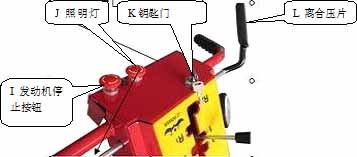 2、點火前,先將操作面板上的紅色旋鈕I(即發(fā)動機停止按鈕)按箭頭方向旋轉(zhuǎn)彈起,然后在發(fā)動機后部左側(cè)位置插入紅色鑰匙B;