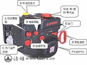 5、上述步驟完成后,可旋轉(zhuǎn)k鑰匙電啟動或手拉H啟動盤啟動發(fā)動機,著火后紅色C緩慢置于風(fēng)門全開位置,熱機1分鐘左右,調(diào)整適當(dāng)?shù)挠烷T大小,即可工作。